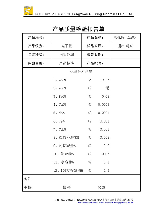瑞興化工有限公司是生產氧化鋅的重點企業,于2008年通過ISO9001:2008質量管理體系認證。“瑞興”牌氧化鋅在國內擁有較大穩定的市場,并遠銷東南亞、中東、中南美等國家和地區,在國內外享有較高聲譽。